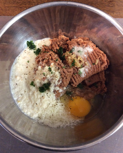 Place the plant-based meat, grated Parmigiano cheese, parsley, egg, finely chopped garlic, breadcrumbs, salt, and pepper in a large bowl. Squeeze the bread to remove most of the milk, then and it add to the other ingredients.