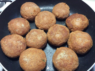 Again using your hands, mold the mixture into balls, and roll them in the flour to lightly coat each ball. I have flattened them to make cooking easier on both sides.