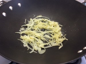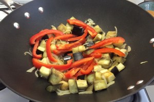 Meanwhile, clean the pepper by removing the internal seeds and pith, cut it into strips, and add it to the other vegetables in the pan.
