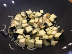 Cut the eggplant into cubes, add them to the pan with onions, cover with a lid and cook.