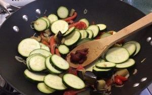 A vegetable fricandò is a tasty mix of summer vegetables that are cooked together in a pan. It also goes by other names, including ratatouille (in French) and fricò, and it is typical of the Italian region where I come from, Emilia Romagna. There are many variations, and different vegetables can be used. One classic uses only peppers, with potatoes and olives.