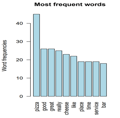 The restaurant I have chosen had the highest number of visits from expert reviewers. The analysis of the most frequent word reports that pizza is often mentioned from customers, who associate it with words such as “soft”, “delicious”, “artwork”, “favorite”, “magnificent”, and “cheesy”. If I had to visit this restaurant, I would order one pizza, probably with mushrooms (funghi) or sausage toppings. Calamari seem like another great option (see the $love word associations). Regarding the place and the atmosphere, it seems like clients think décor is awesome. Menu is “sophisticated”, and words such as “fresh” and “salads” are present. In fact, checking the word “salad” we find a lot of details: chickpeas, veggies, avocado, tomatoes, addictive, cabbage, freshest, refreshingly, robust, and other ingredients. Therefore, a salad seems like a good choice at this restaurant. The comments regarding service are various and probably require further investigation regarding reservations, even if service was generally appreciated. Customers also think that bar and bartenders are cool, but sometimes the area is too crowded.