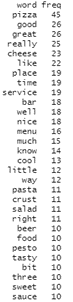 Since we have the list of the most common words, we find the associations, to see what customers say about pizza, or what is good, what is great, and so on…Of course you can pick other words if you like. It looks like pizza is good, and they have great cheese.