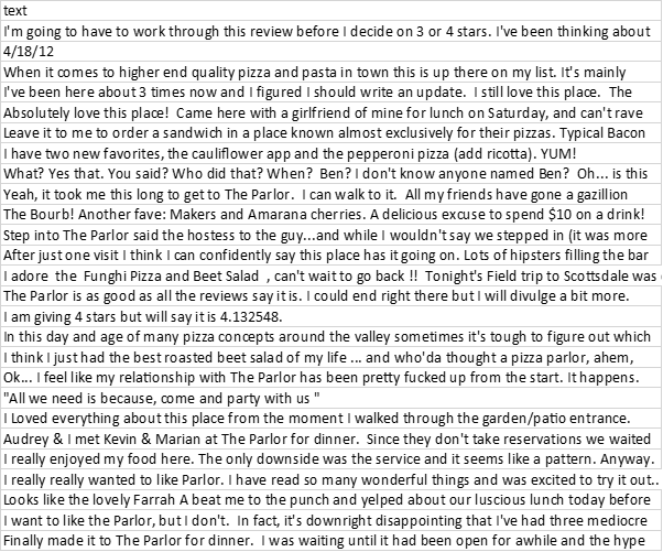 First, I can read all the comments in text columns, to see whether they match with the business_stars variable, which is > than 4 stars. At least, I will get an idea about what expects me.