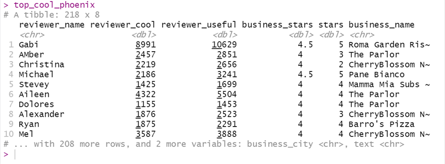 select(reviewer_name, reviewer_cool, reviewer_useful, business_stars, stars, business_name, business_city, text) %>%
