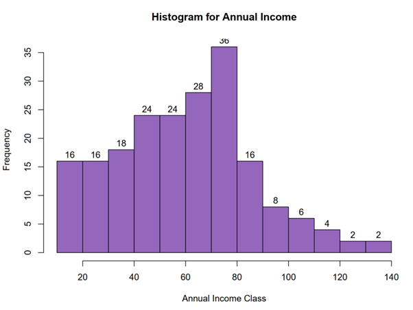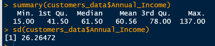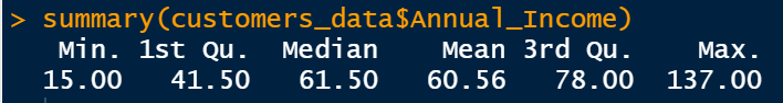 For each variable, we obtain a summary of minimum, median, mean, maximum, 1st quartile, and 3rd quartile for numeric values. For example, the minimum age of our customers is 18 years, the maximum age is 70 years. Their annual income varies from $15 k to $ 137 k, the mean is $60.56 k.
