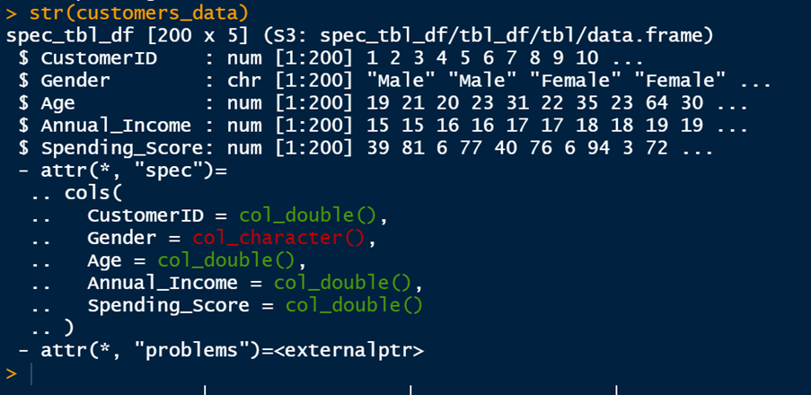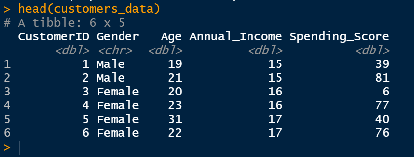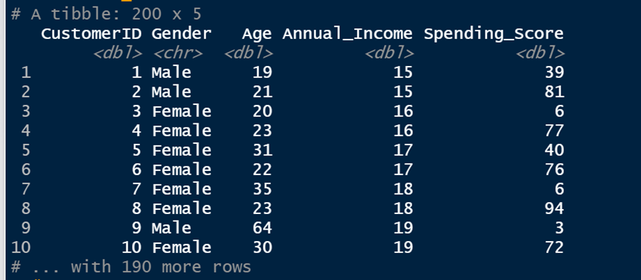 Before loading the dataset, I recommend changing the names of the variables “Annual Income” and “Spending Score” into “Annual_Income” and “Spending_Score”, because spaces in variable names can sometimes lead to syntax problems.