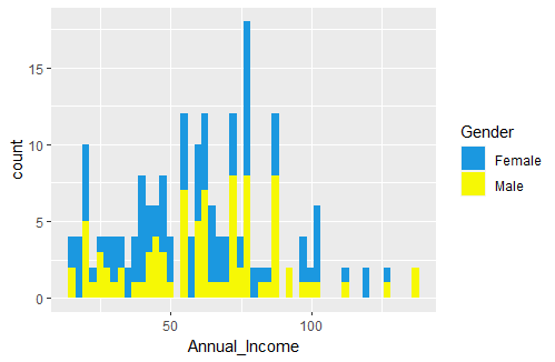 income_plot <- ggplot(customers_data,aes(x= Annual_Income, fill=Gender)) +geom_histogram(bins = 50)