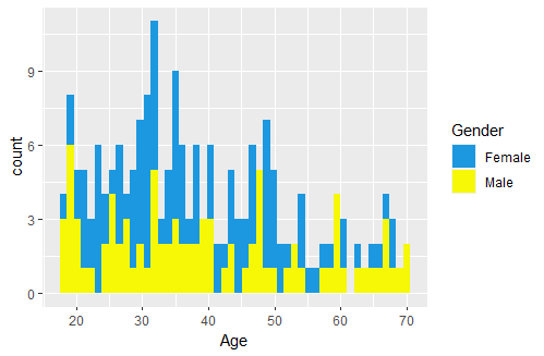 my_plot <- ggplot(customers_data,aes(x= Age, fill=Gender))+geom_histogram( bins = 50)