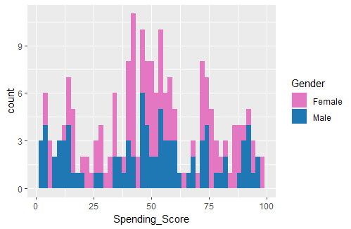spscore_plot <- ggplot(customers_data,aes(x= Spending_Score, fill=Gender)) +geom_histogram(bins = 50)