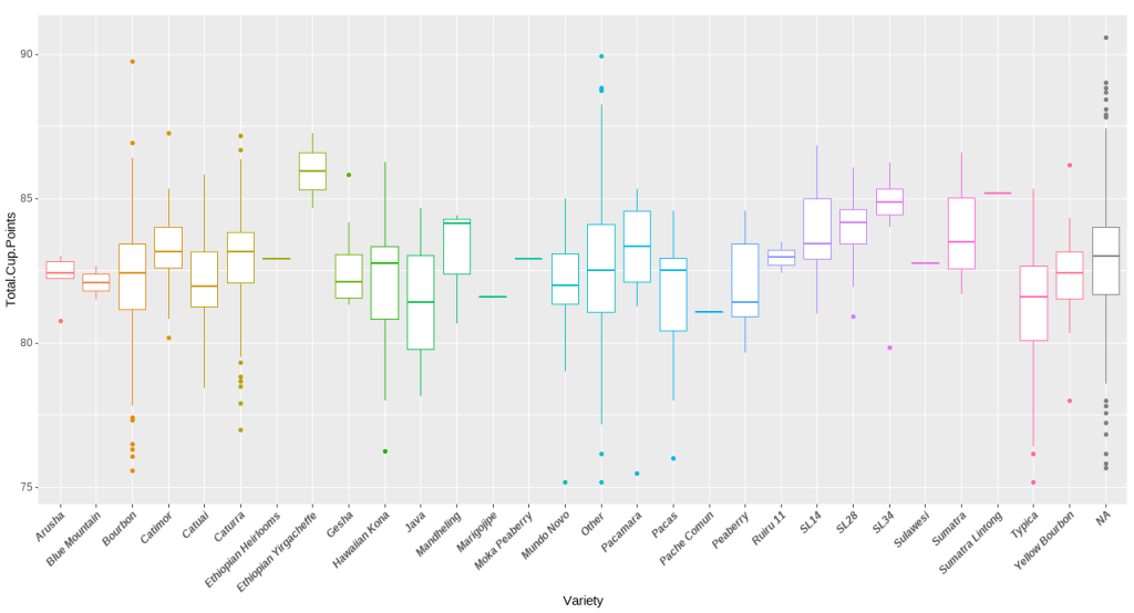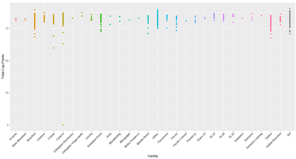 l <- ggplot(data=arabica_clean, aes(x= Variety, y= Total.Cup.Points, color = Variety)) +