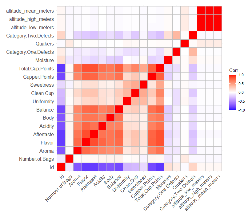 We see that Total.Cup.Points is positively correlated with a number of variables, including aroma, flavor, aftertaste acidity, body, balance, and sweetness.