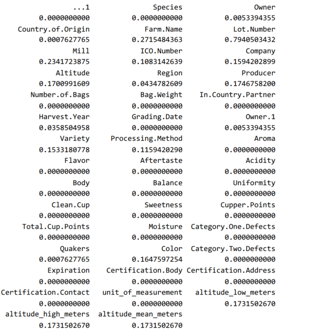 Two datasets are provided, one for the Arabica beans and one for the Robusta beans. Good coffee requires a balanced mix of these two species (SpecialCoffee, 2018); however, the two datasets cannot be properly merged because the variables are different. Also, the Robusta dataset contains a small number of observations – less than 30 – compared to more than 1300 observations in the Arabica dataset. Therefore, I restrict attention to the Arabica dataset. Here is a snapshot of the variables, together with the percentage of missing values for each variable: