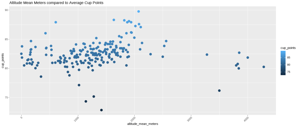 This plot relates the altitude at which coffee is harvested to the ratings (cup_points) the coffee received.