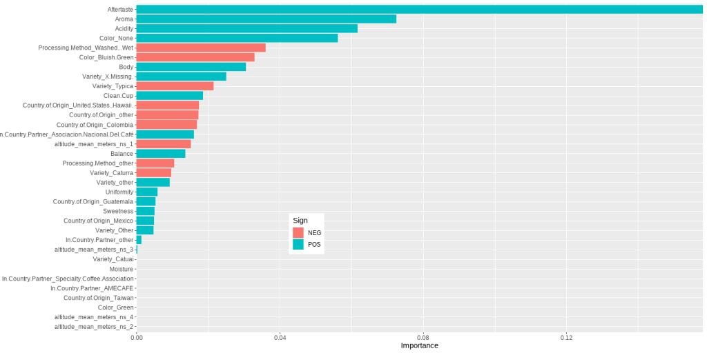 LASSO Model results are similar to the ones obtained using Random Forest, and this model specifies some negative correlations: you can see them in red (Preprocessing Method Washed Wet, Color Bluish Green, Variety Typica, etc…).
