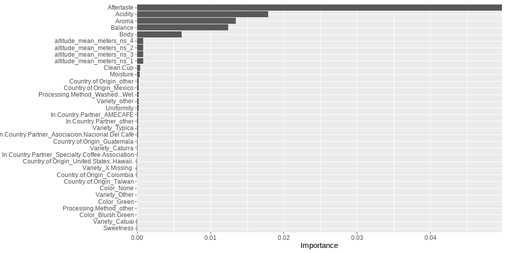 And what about Ethiopia? Ethiopian Yirgacheffe is another variety with a distinctive taste. Gray defines it as “delicate, floral, and tea-like, with shimmery citrus notes and a clean, light body” (2021). The other variety produced in Ethiopia is called “Ethiopian” – it is more common and has an “unpredictable” quality. However, what makes the difference in terms of quality and flavor is the natural processing method. This information confirms the results of the analysis and explains why the model has negatively classified the “washed method.” The method of processing appears to matter, and the results from the LASSO model are similar to the patterns shown in the graph “Processing method compared to average cup points.” Coffee processed using the washed-wet method has lower cup points and less flavor. The average rating compared to the number of coffee bags checked from table 9 does not provide details about the quality, the model provides a different interpretation together with table 5.