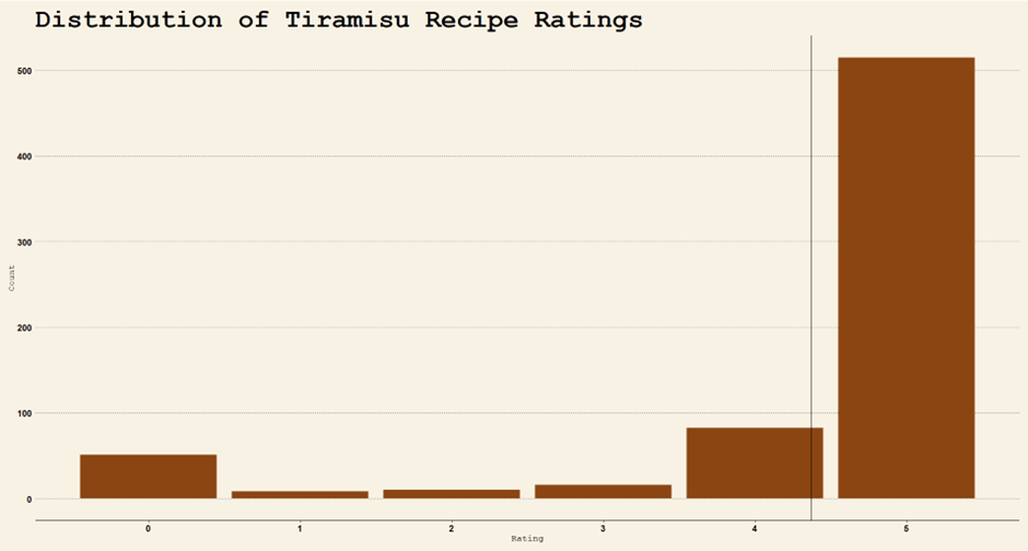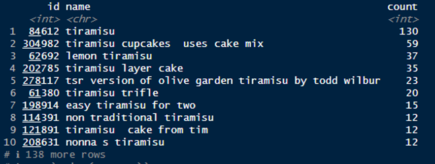 There are 515 5-star ratings out of 682 total observations in the dataset, and there are 147 unique recipe names. Among these recipes, some have been rated more than others. The recipe simply named “tiramisu” ranked first (130 times).