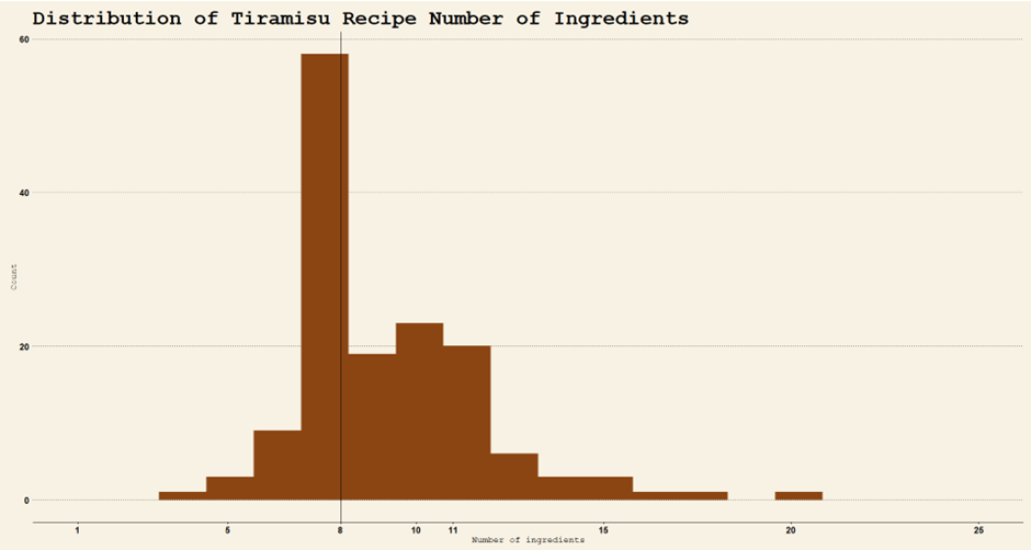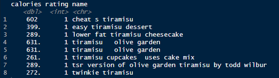 The tiramisu data comes from the same dataset I previously used to analyze carbonara and pizza recipes. The complete dataset scraped from Food.com is available here. The dataset has 682 rows and 25 columns (26 included the grepl result).