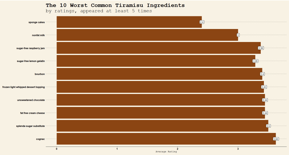 Here is a partial list of the ingredients associated with the lowest-rated recipes: sponge cakes, nonfat milk, sugar-free raspberry jam, sugar-free lemon gelatin, bourbon, frozen light whipped dessert topping, unsweetened chocolate, fat-free cream cheese, Splenda sugar substitute, and cognac.