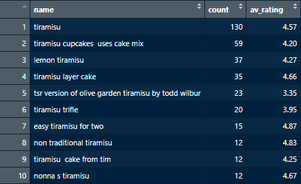 “tiramisù” seems like a very good choice — it has been reviewed 130 times and has an average rating of 4.57. Some of the recipes have slightly higher average ratings, but many fewer reviews and therefore might be appealing only to people with special tastes.