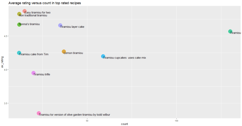 Finally, among the top 10 most reviewed recipes, 2 have average ratings below 4.0 — the “Tsr version of Olive Garden tiramisu by Todd Wilbur” and the “Tiramisu trifle”. This is not too surprising. As I found for pizza and carbonara, recipes with the names of restaurants or celebrities in the title often had lower ratings, perhaps because they did not live up to expectations. And, tiramisù trifle just sounds like one step too far.