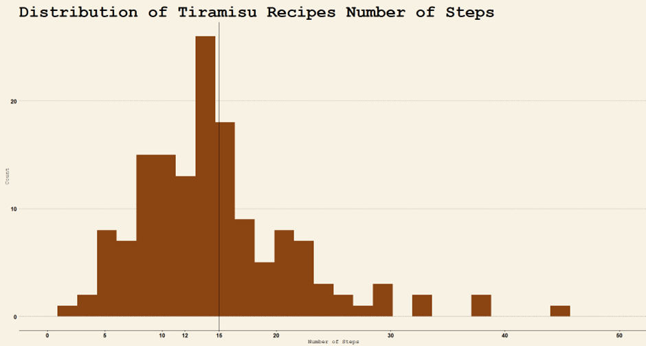 The average number of steps for preparing tiramisu is 15.77, and the median is 15. So, the average rating by count makes sense.