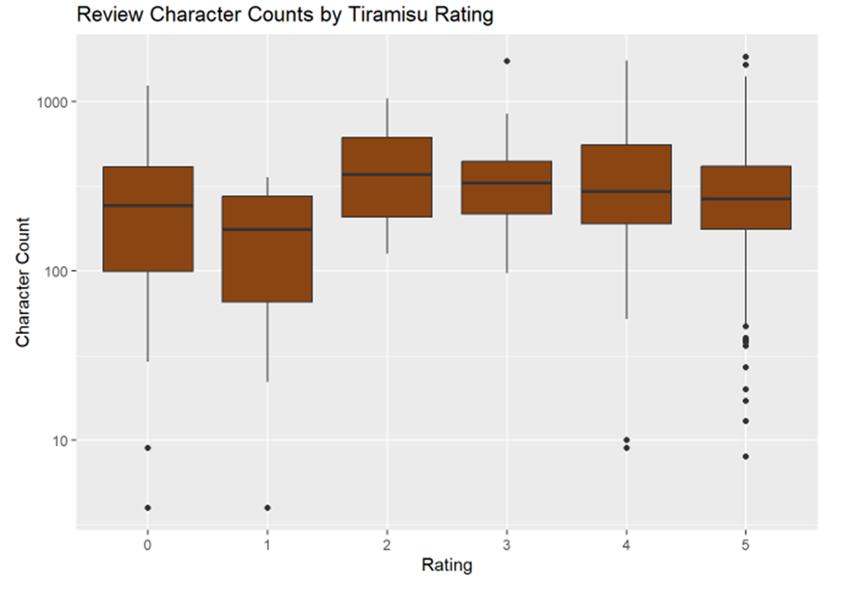 2-star ratings contain more words and generally more detailed explanations (similar to what I found for pizza, carbonara, and coffee)