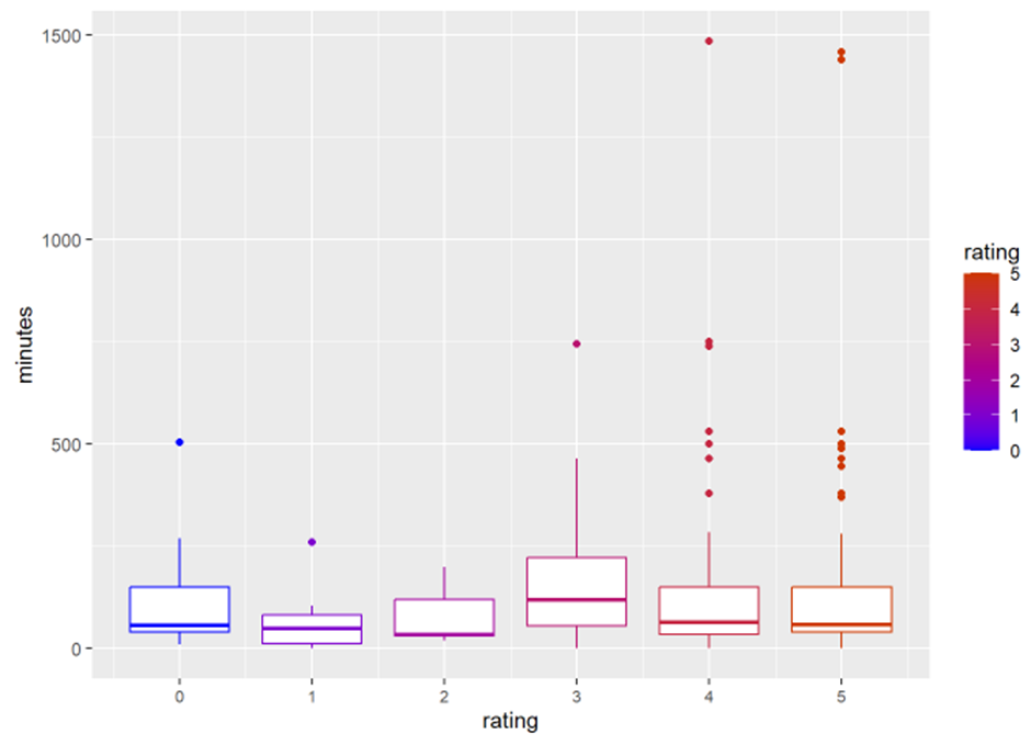 Probably, cooks who want to make tiramisu are ready to devote some time to its execution. Counting the preparation time is tricky, however, and the recipes on the website do not all follow the same rules — for example some users calculate the rest time together with the preparation of the dessert. This is the boxplot I obtained without adjusting the minutes.