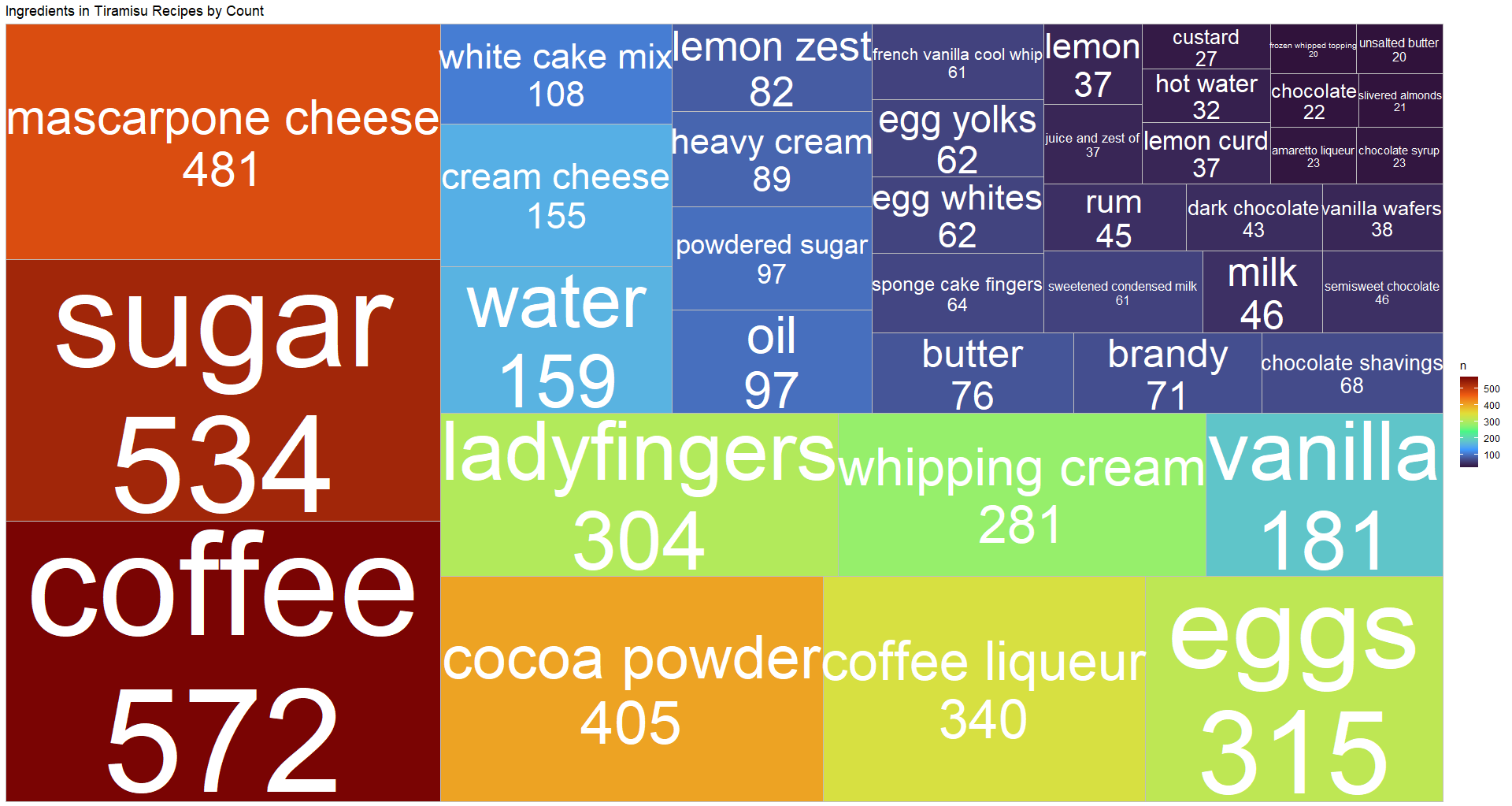 The top-rated recipe has a very simple name, it is very easy to prepare, the ingredients seem reasonably classic, the number of steps, and the prep description are straightforward. One note about the use of liquor Tia Maria in this recipe explains its presence in the previous tree map (count 139); Tia Maria looks like a widely appreciated flavor addition. Probably, coffee liquors add a zing, given that Kahlua liquor as well has been used 167 times in the recipes.