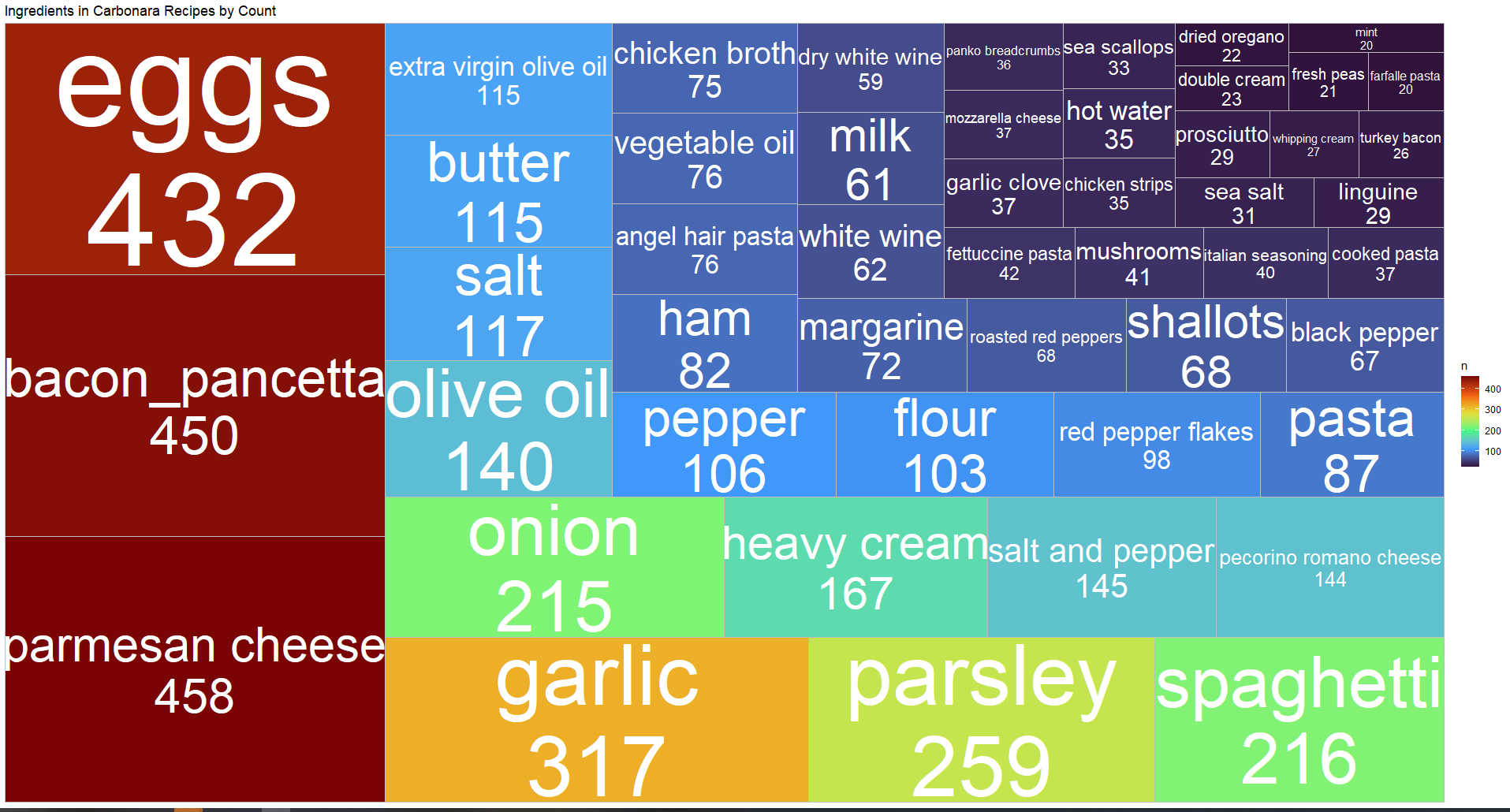 Imagine you want to prepare a food recipe, but you’re unsure which one to choose. You decide to search the web and find yourself overwhelmed with numerous options, particularly for famous recipes. In this situation, I suggest utilizing the power of R and the incredible “treemapify” package to visually represent the most commonly used ingredients. Specifically, we can analyze the frequency of ingredients in highly rated recipes on food.com.
