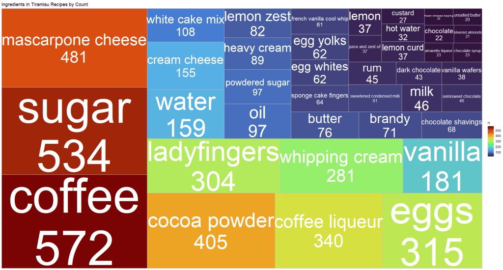 To ensure a focused analysis, for the tiramisù recipes I filtered out ingredients with a count of less than 20 (out of 682 total observations). Additionally, some ingredients have been grouped together, such as “mascarpone” with “mascarpone cheese” and “cocoa” with “cocoa powder,” to provide a more comprehensive view.”