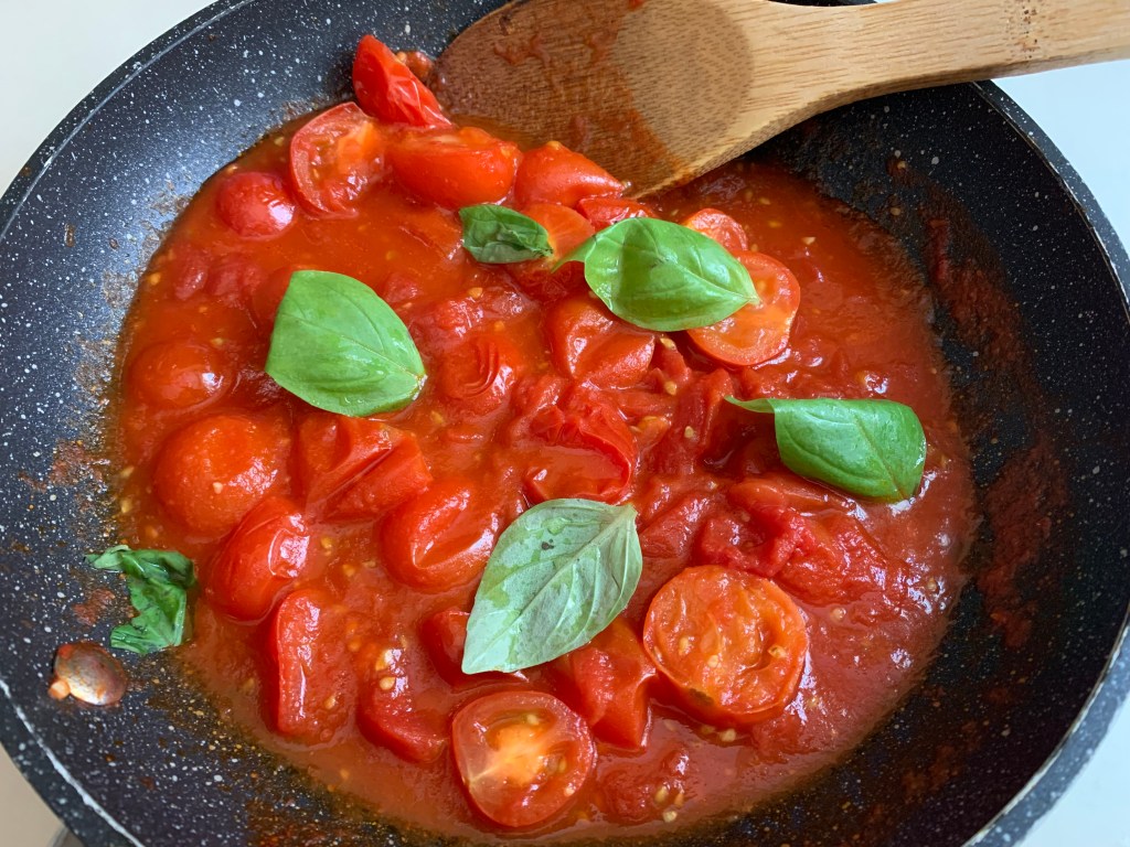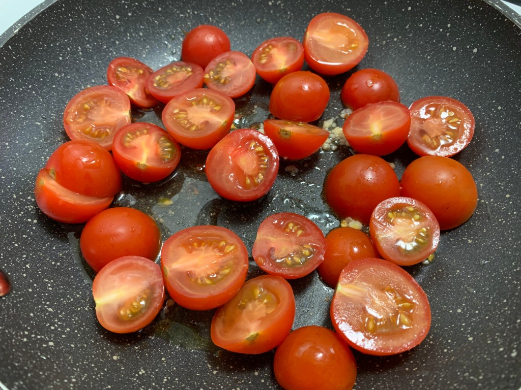 In the meantime, wash the cherry tomatoes and cut them in half. Heat the oil in a pan, add the minced garlic and minced chili flakes. As soon as the garlic starts to brown, add the chopped cherry tomatoes and basil.