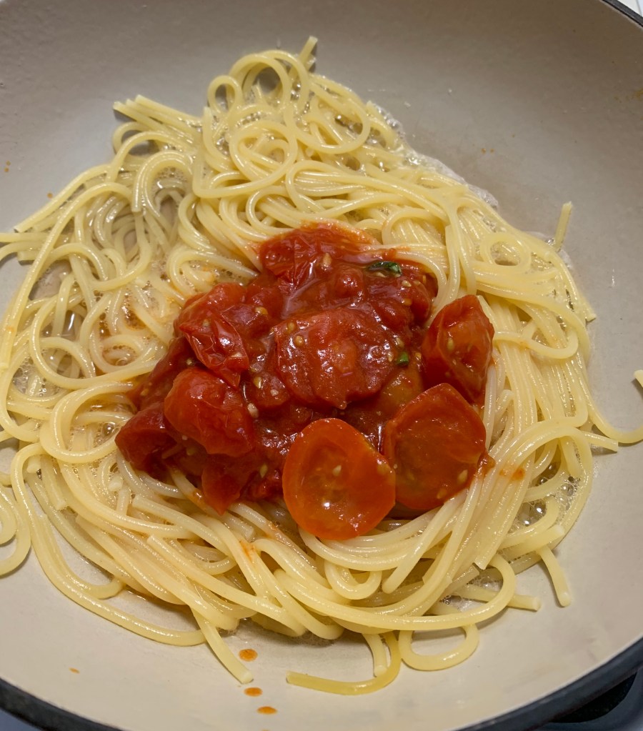 The ingredients for Scarpariello are simply spaghetti, fresh tomatoes, garlic, basil, chili flakes, and provolone, Parmigiano, pecorino, or other grated cheese. The secret of this recipe is the “mantecatura,” which means mixing the pasta as if it were a risotto until it reaches a creamy texture full of starch. In my recipe, the mantecatura is begun halfway through cooking.
