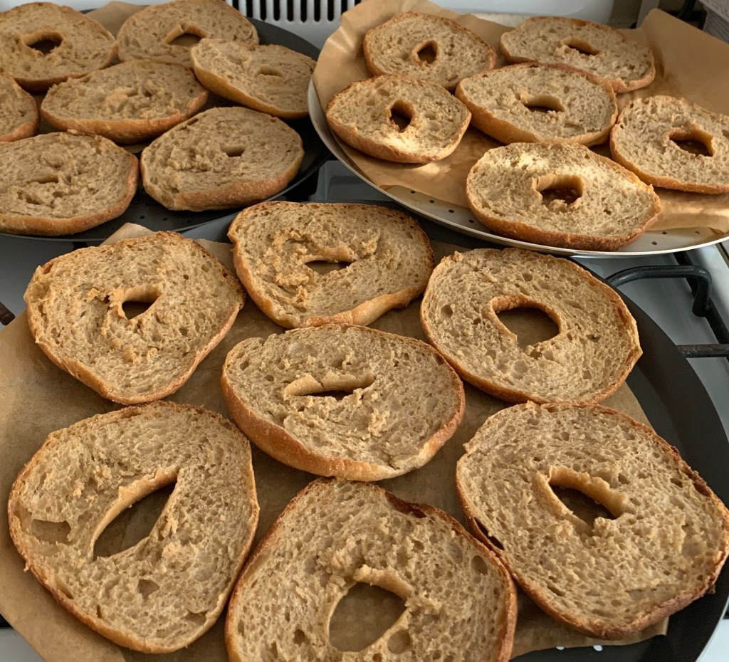 Once cooled, return the friselle to the oven at 250° F for about 50 minutes. This step will toast them and eliminate any remaining moisture from inside.
