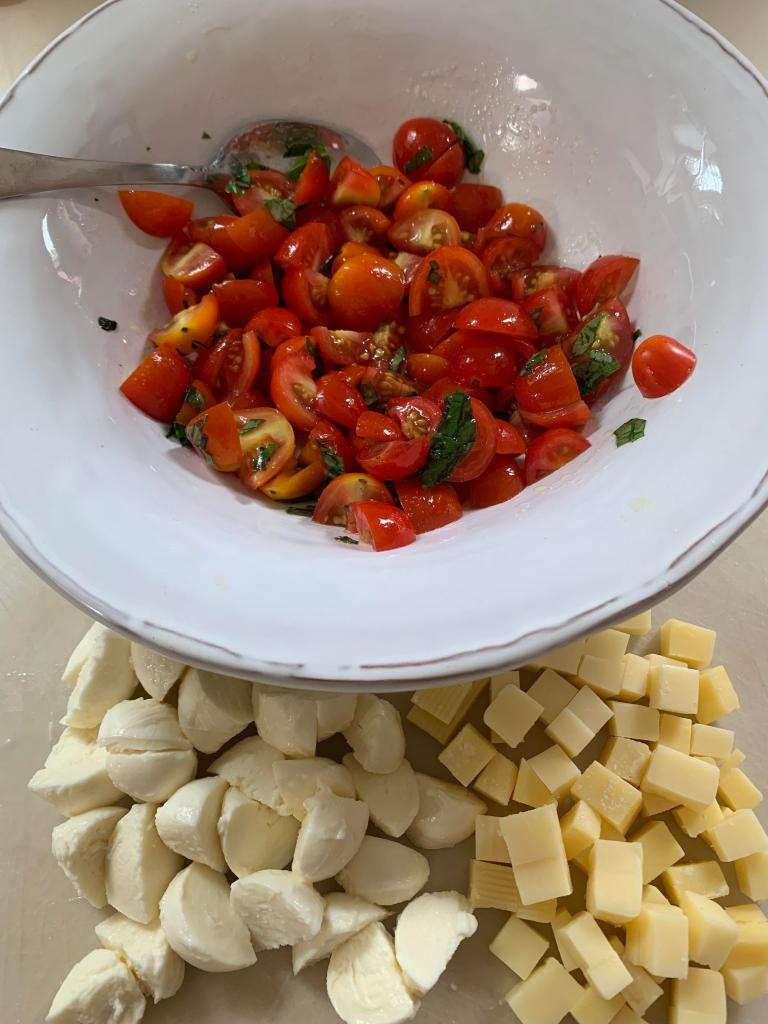 2. While the pasta is cooking, wash and chop the basil. Then, dice the tomatoes, mozzarella, and caciotta (or provolone, scamorza, or other savory hard cheese as you like).