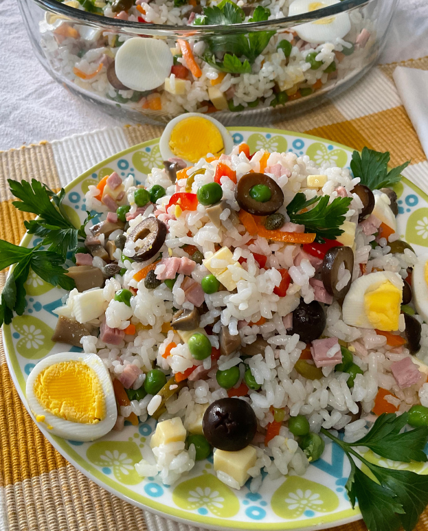 Mix the ingredients with the rice, adding oil and salt if needed. Cover the bowl containing the rice salad and let it rest in the refrigerator for an hour before serving and enjoy!