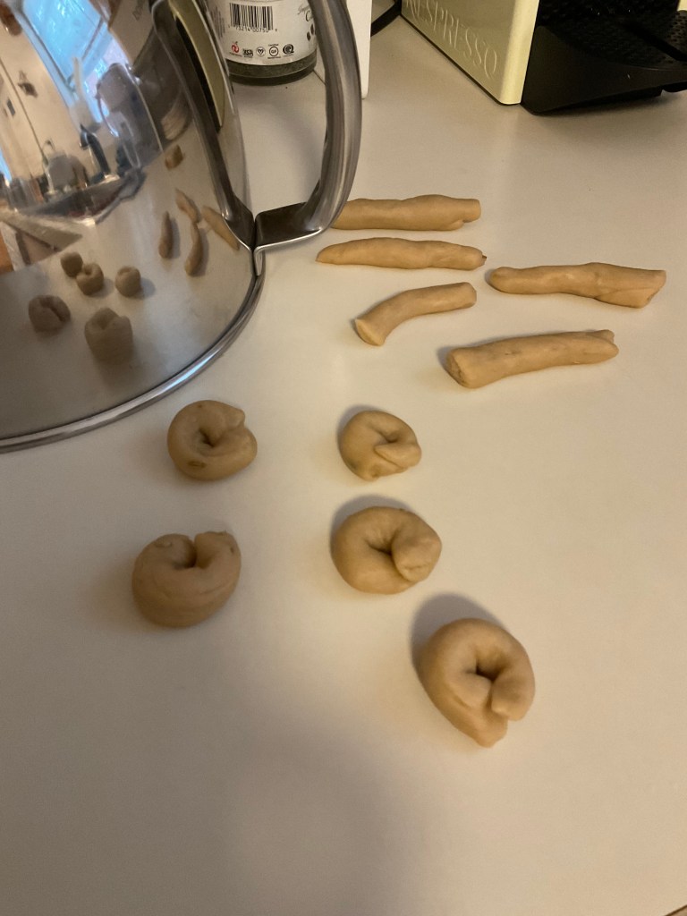 5. After 30 minutes, unwrap the dough, cut it into strips, and roll each strip with your by hand to make “snakes” approximately 1cm thick. Cut the “snakes” into pieces about 3-4 fingers wide. Join the ends of each piece to form a small circle, and press the ends together securely to prevent them from opening during cooking.