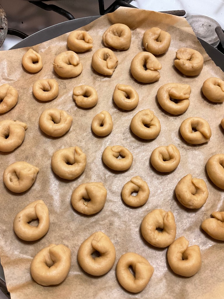 7. Line a baking pan with parchment paper and arrange the tarallini with adequate space to prevent them from sticking while baking.