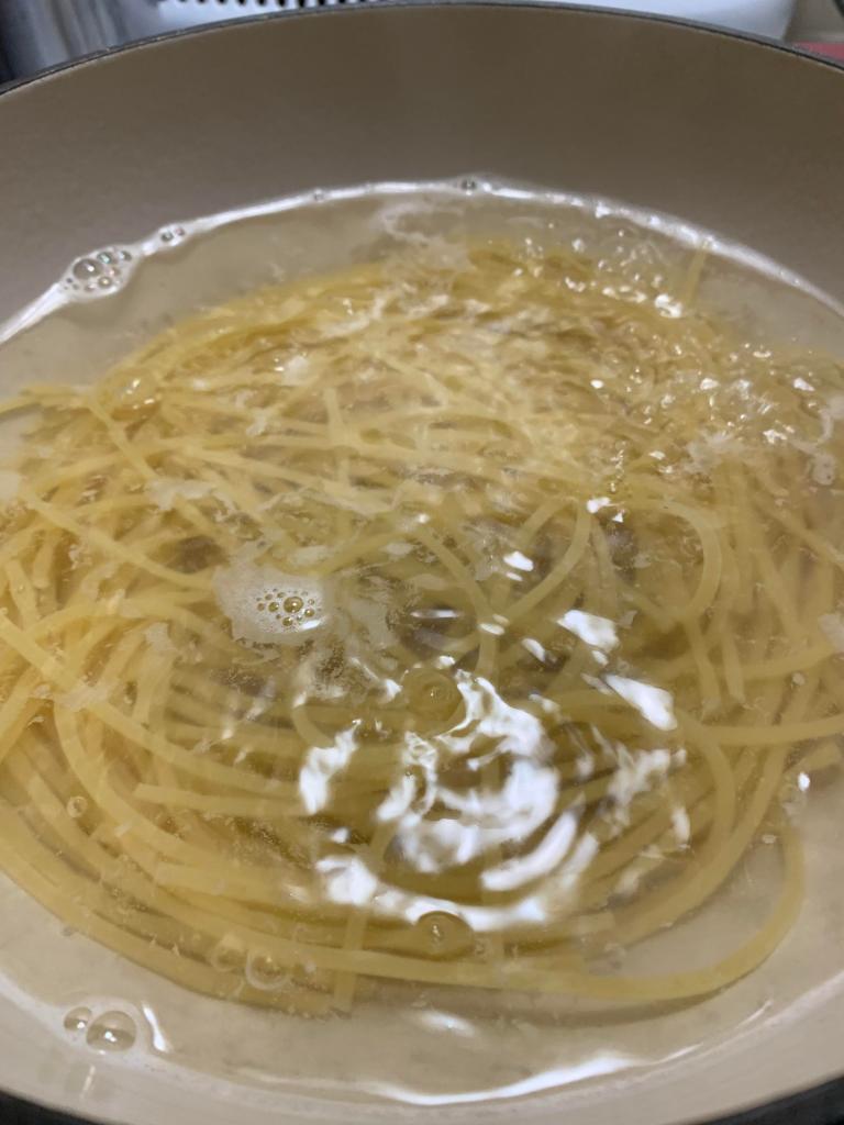 1. Bring water to a boil and add salt. Then, add the spaghetti.