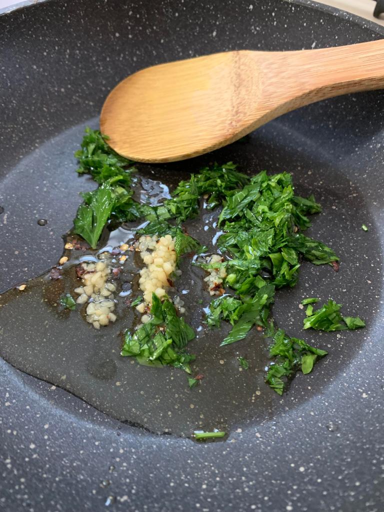 3. In a pan, heat 2 tablespoons of extra virgin olive oil. Add the parsley, garlic, chili flakes, and optional anchovy. Sprinkle with salt and mix, heat for 1 minute.