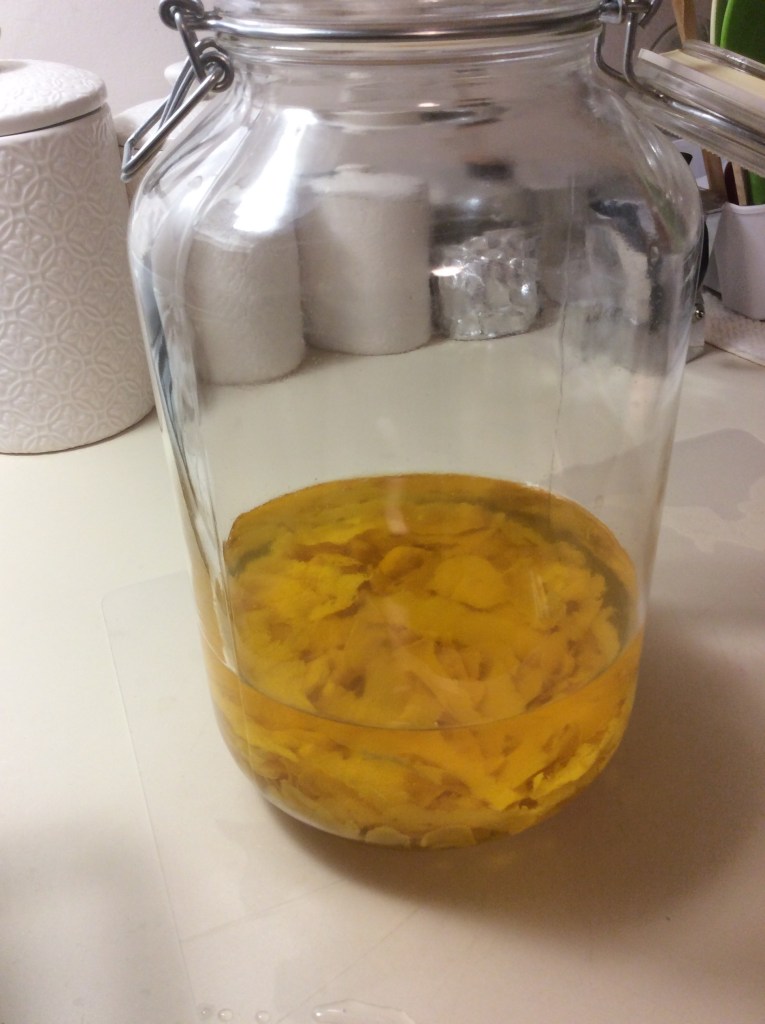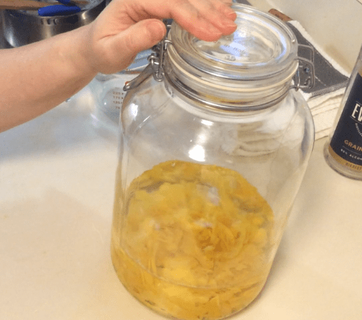 Place lemon peels into a clean 1-gallon glass jug, then add 500 ml of grain alcohol.