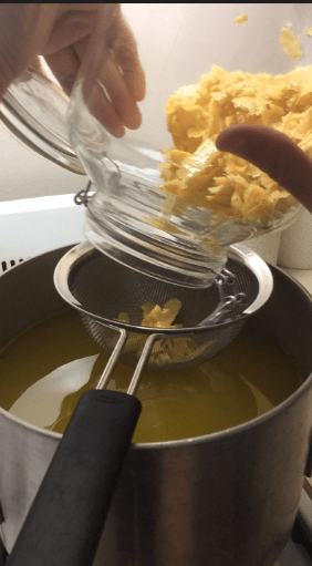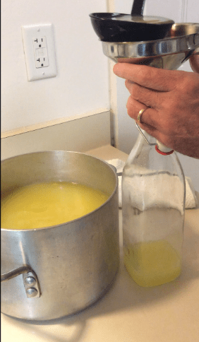 Once the sugar-water mixture cools, position a sifter atop the saucepan. Gradually ladle the lemon-infused alcohol from the jug into the sugar-water mix, retaining the lemon peels in the sifter.
