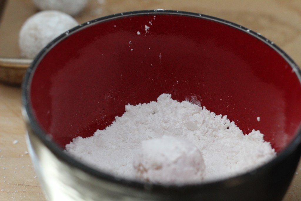 To coat the cookies, fill one small bowl with granulated sugar and another with powdered sugar. Roll each ball first in the granulated or brown sugar, then in the powdered sugar.