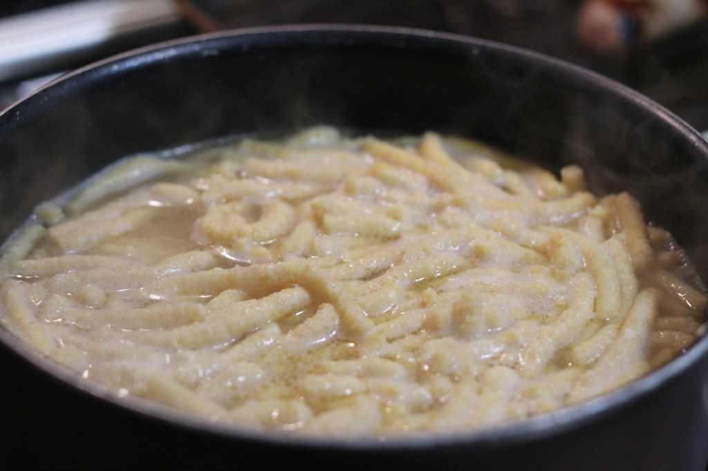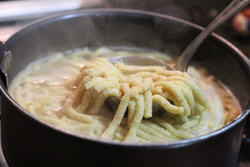 3. Bring the broth to a boil, then place the dough balls inside a potato ricer and press them directly into the broth. You can continue pressing and cut the strands only at the end using a knife.
