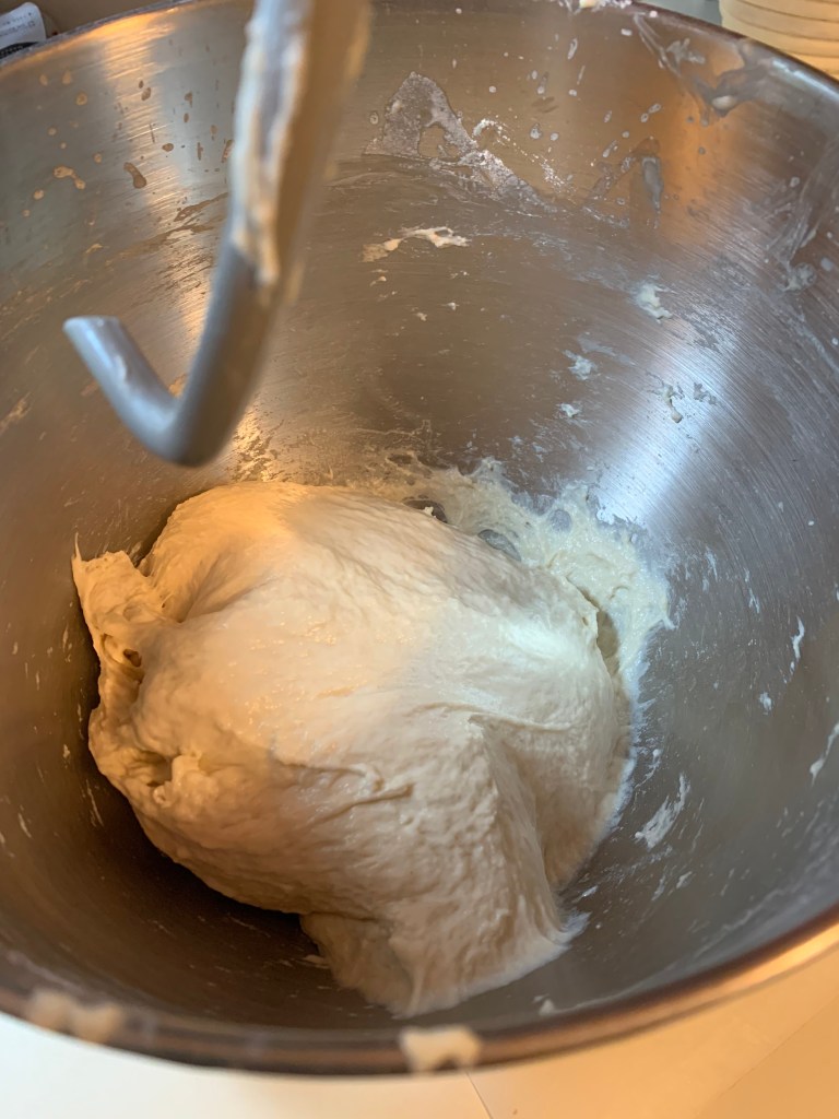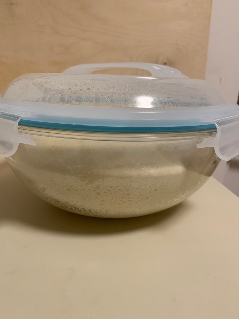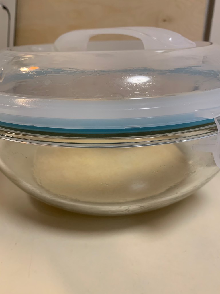 Grease a large bowl with 1 tbsp of oil (using a brush) and add the dough. Give the dough a few stretches, then put the dough rest in a closed container or covered with plastic wrap, or inside a turned-off oven until it has doubled in size.