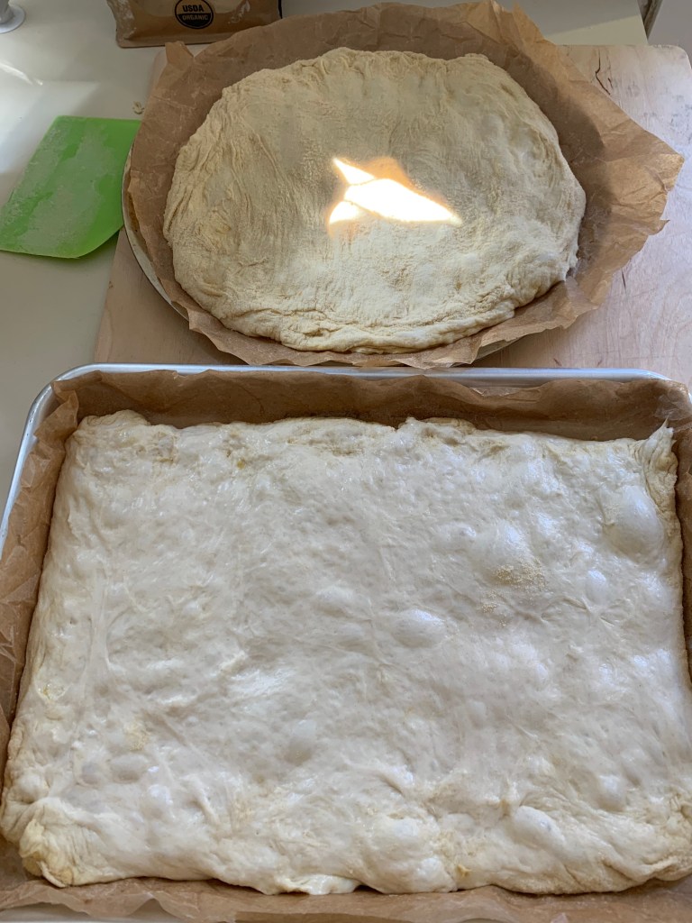 Once the dough has doubled, put the semolina flour into a baking tray. Gently pour the dough into the semolina and flatten without pushing too much – you want it to keep the nice bubbles inside. Line a baking tray with parchment paper and grease with 1 tablespoon of olive oil using a brush. Place the stretched dough into the pan, press it using your fingers (if you prefer you can use a fork to pierce the focaccia here and there), and let it rest for about another hour. I prepared a half-pan and another small one because my oven is small, but if you have a regular-sized oven, you can place the whole dough into a single pan.