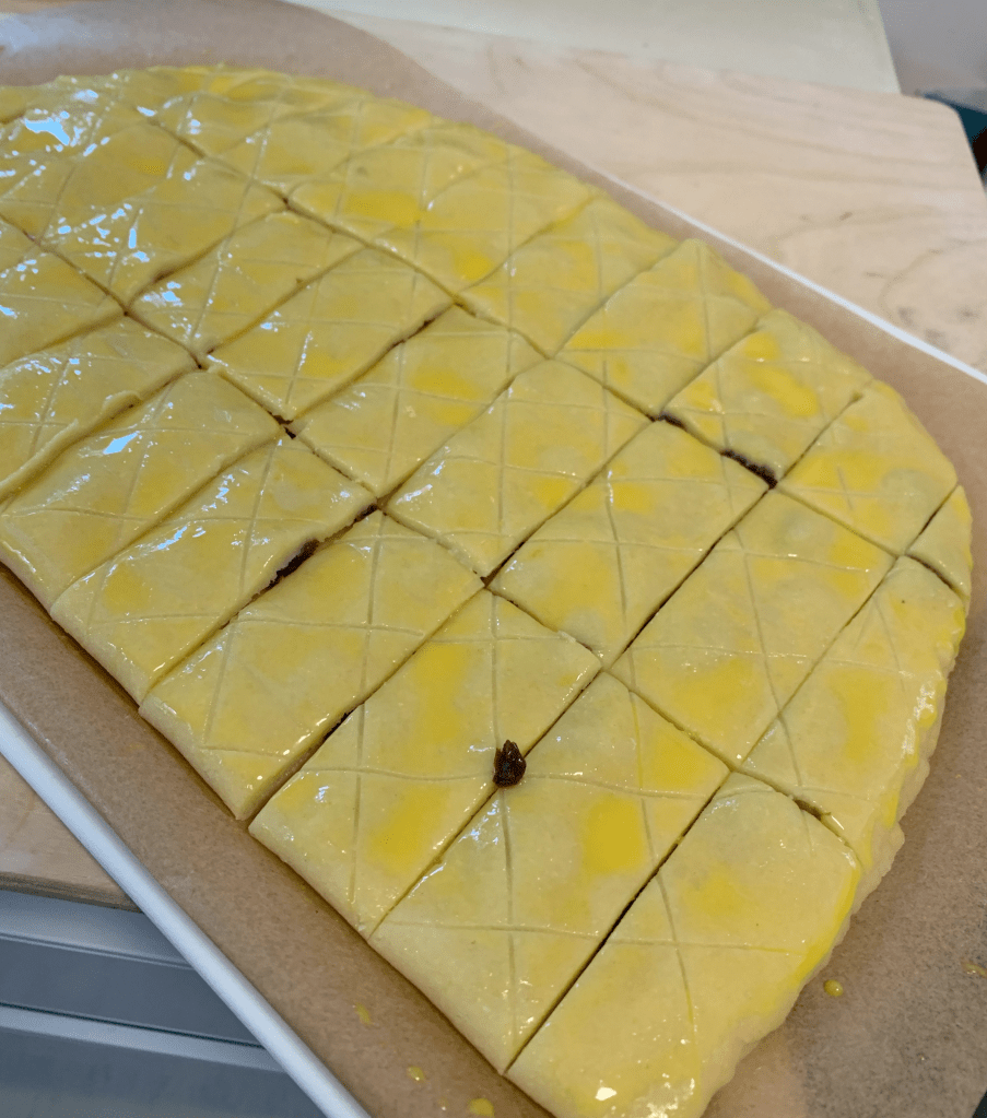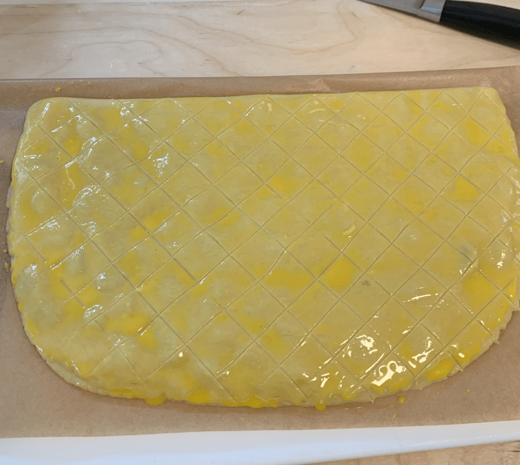 Decoration. Remove the dough from the fridge and brush the top with 1 beaten egg yolk mixed with 2 tablespoons of milk, then score lightly with the spine of a knife.