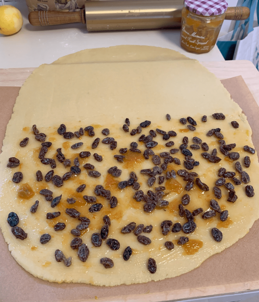 To refrigerate, slide the parchment paper and raisin-jam filled dough onto a cutting board or sturdy tray. Refrigerate for about 1 hour, covered with cling film.
