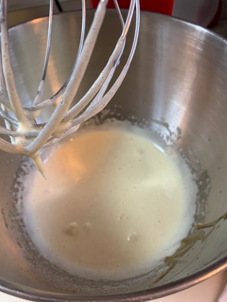 In a stand mixer or with a hand whisk, beat the eggs for a few minutes, then add the sugar and honey. Continue whisking until you have a nice thick foam.