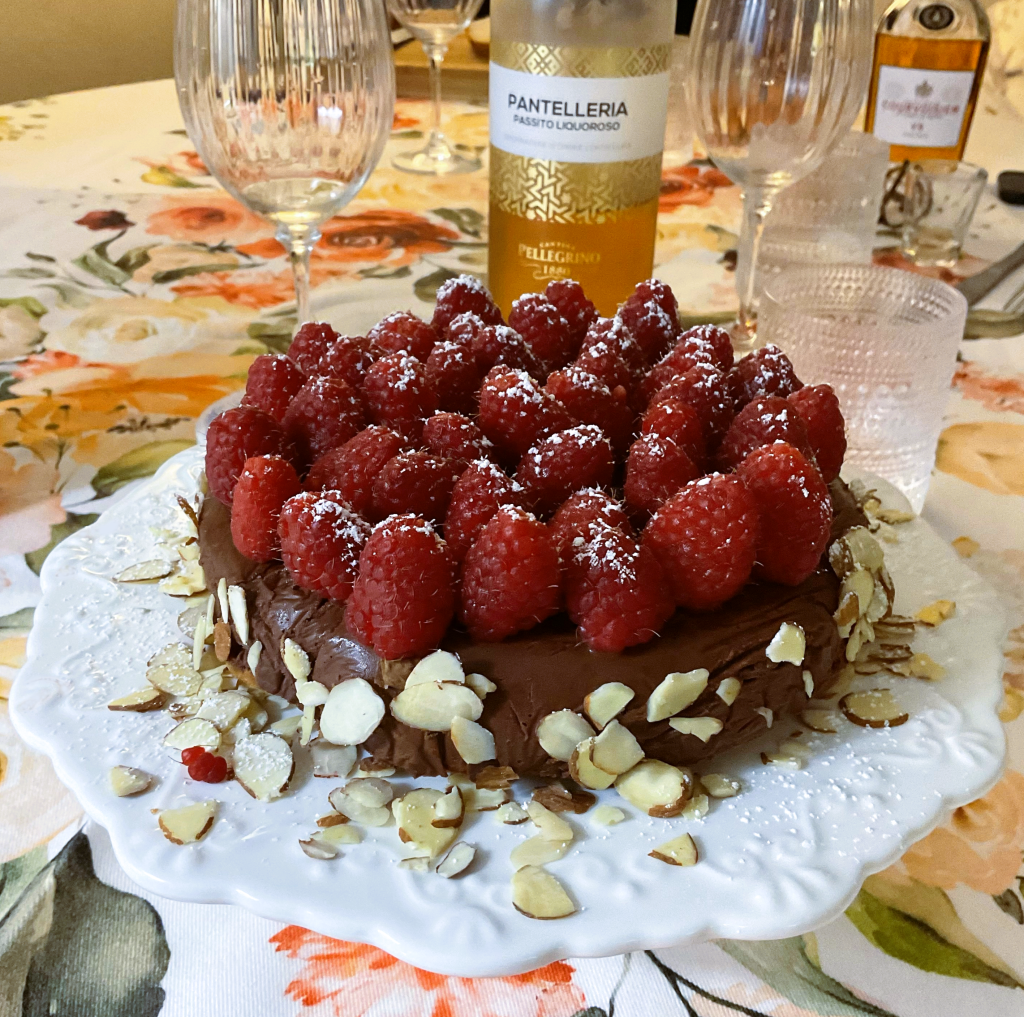 We really enjoy dessert wines, and we always serve it with a small glass of “Passito di Pantelleria”, which enhances the dark chocolate flavor and the freshness of the raspberries.